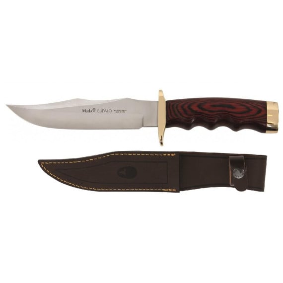 Se trata de un cuchillo Muela de hoja enteriza, con acero inoxidable X50CrMoV15, con una longitud de hoja de 170mm, su mango es de madera, incluye funda de cuero para este.